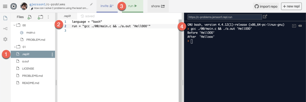 Ahora, si quieren ver cómo funciona el código y no quieren clonarlo, aquí un espacio para jugar usando el navegador https://repl.it/@jersson1/c-problems. De ser así, tengan especial atención en el archivo .replit