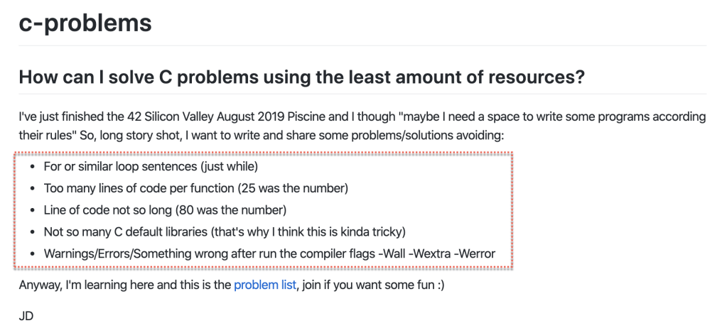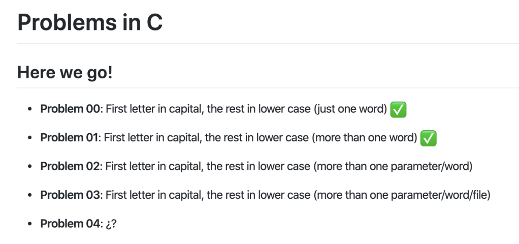 Bueno, para hacer la historia corta, mi interés –y cariño– por el [lenguaje C] ha vuelto, así que he propuesto cuatro problemas que parecen simples, pero si intentas resolverlos con la menor cantidad de código, librerías y además buscas hacerlo entendible, pues ahí llega la complejidad. De estos problemas ya he resuelto dos y los he dejado en un repositorio esperando que alguien quiera unirse para al menos proponer nuevos problemas. Por mi parte ya tengo algunos en mente, pero tengo que ponerlos en limpio.
