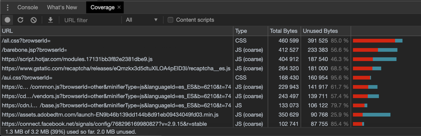 Si queremos empezar con estas prácticas, algo que nos podría ayudar está incluido en las herramientas del navegador web. Una de las que ha llamado mi atención es la utilizada para analizar la cobertura de los archivos JavaScript y CSS. Esta viene en [Chrome] y no es complicado de usar/entender.